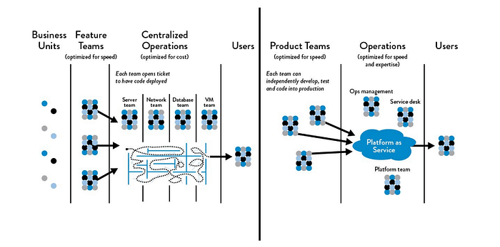 The general movement is from functional alignment to market-oriented. The thinking is to benefit from the strategic impacts of Conway's Law, make the silos belong to the customer by running a train through the functions.